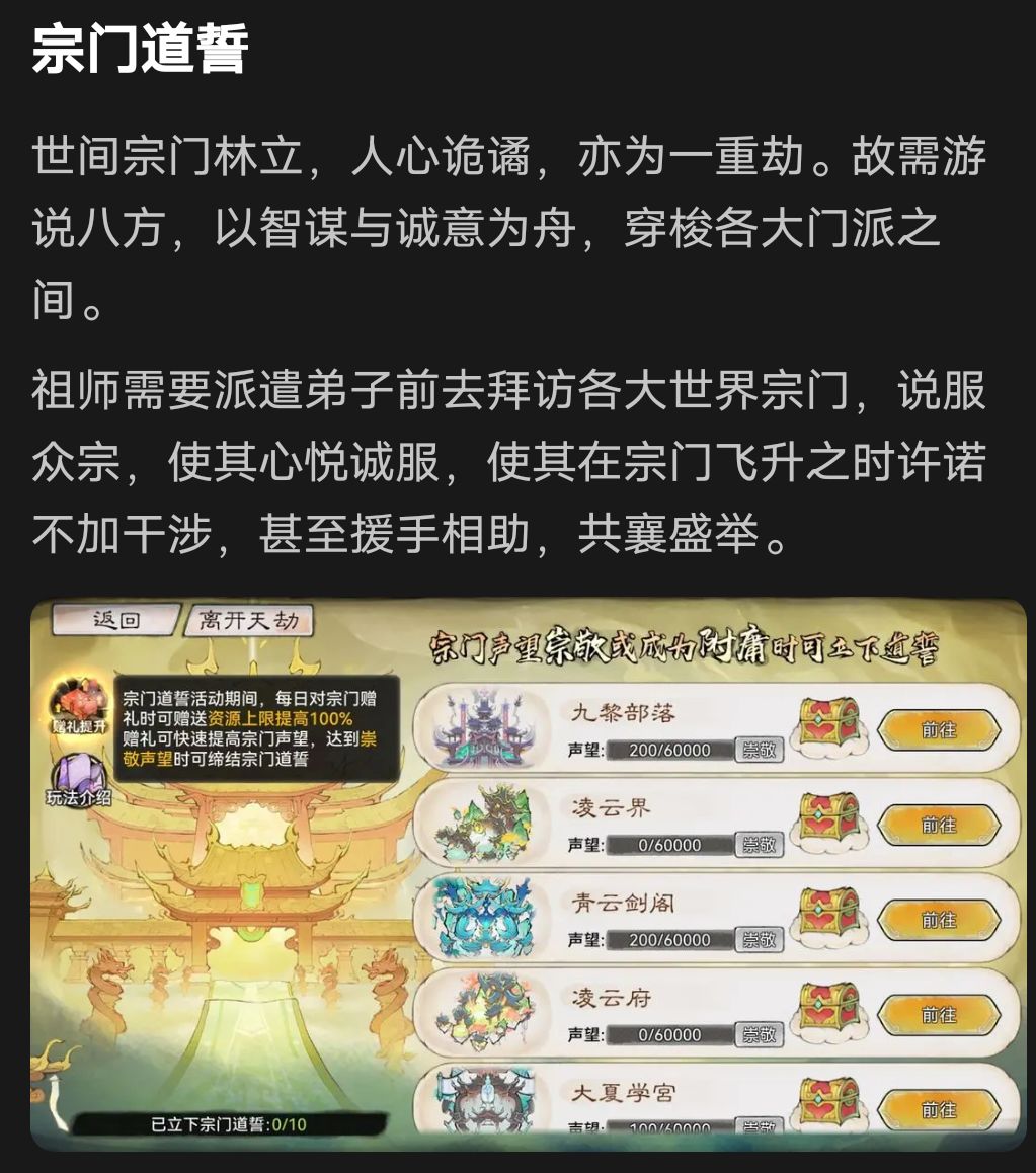 第三部分,宗门道誓:游说八方,以智诚为舟,使各宗心悦诚服。这一部分可以有,但为什么要十个宗门都同意呢,少一点不行吗,我就不信8个宗门与我交好,另外两个敢蛐蛐我,所以这里希望猫子能够调整一下。