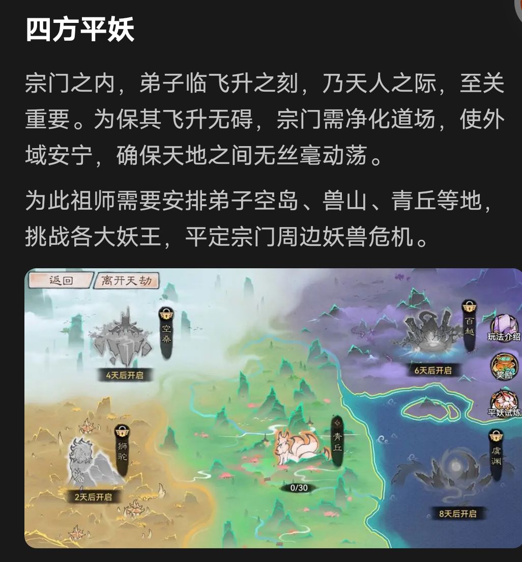 第二部分,四方平妖:平妖兽,净化道场,安宁域外。这一部分也能接受,毕竟妖兽不除等你突破的时候来捣乱也不好。