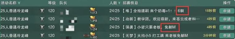 熟悉的打开招募,检索25普通冷龙峰,黑话解释:暂6/6躺:暂时有6个躺本的老板,一般来说是1-10免躺:躺本免费,不需要最低消费多少躺m:为了避免职业冲突,让老板利益最大,躺本前都必须密聊团长询问,还要不要某职业的躺本老板,点击队长D,右键密聊格式如下图2: