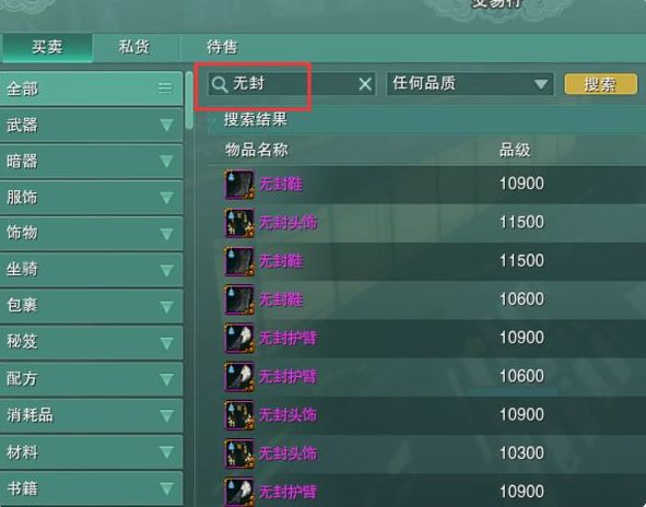 3.无封装-交易行搜索【无封】,价格很高,部分可作为毕业装。部位包含头、手、鞋、项链、腰坠、暗器。最高品级为15200品