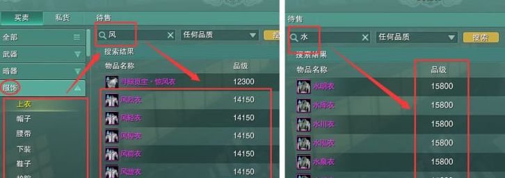 2.切糕装-交易行服饰类目搜索【风]或者【水】。切糕装包含6个部位,风系列为14150品,水系列为15800品(记得看清推荐门派哦)