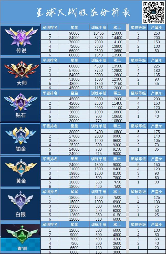 给新手准备了一些数据表,平时大家都用得到,可以合理规划自己的资源利用,避免浪费,还要花钻石去重生,得不偿失。军团Boss收益还是可以的,有条件一定要买满到五次,比较能用钻石买到的资源还是香的。好了,祝大家发展顺利!
