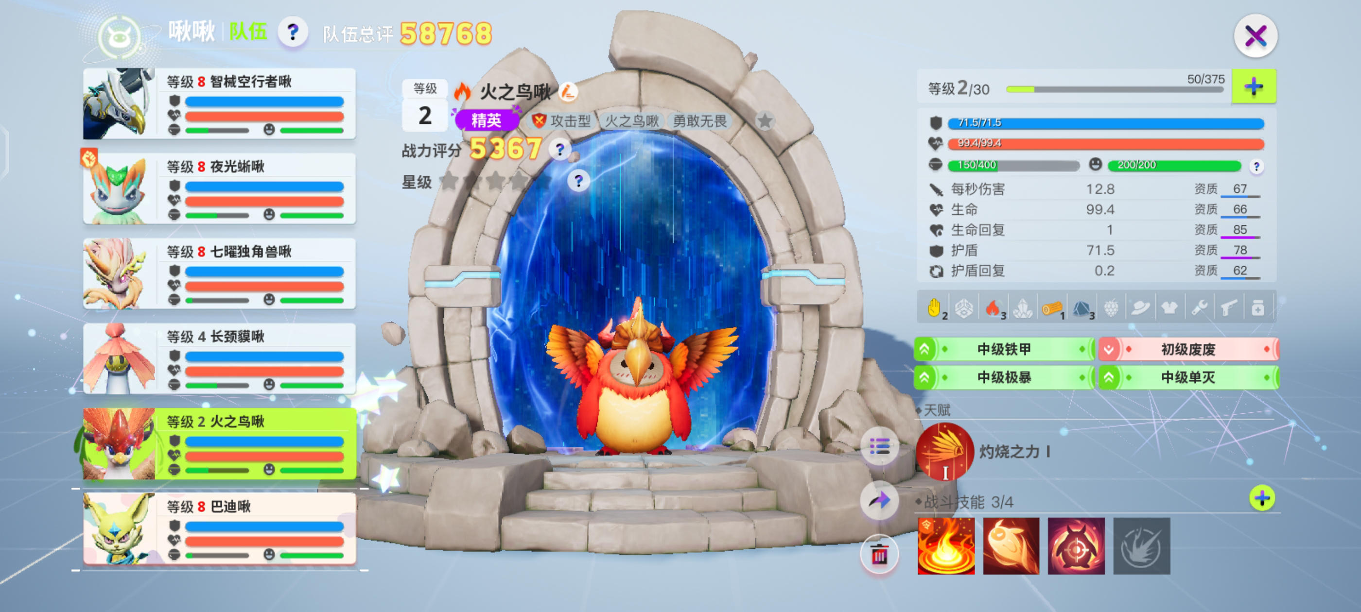 啾啾建议使用火之鸟啾啾,昨天直播福利赠送的火之鸟就很好用拥有群体伤害技能,前期不管是刷营地,还是打BOSS都是伤害很高的。