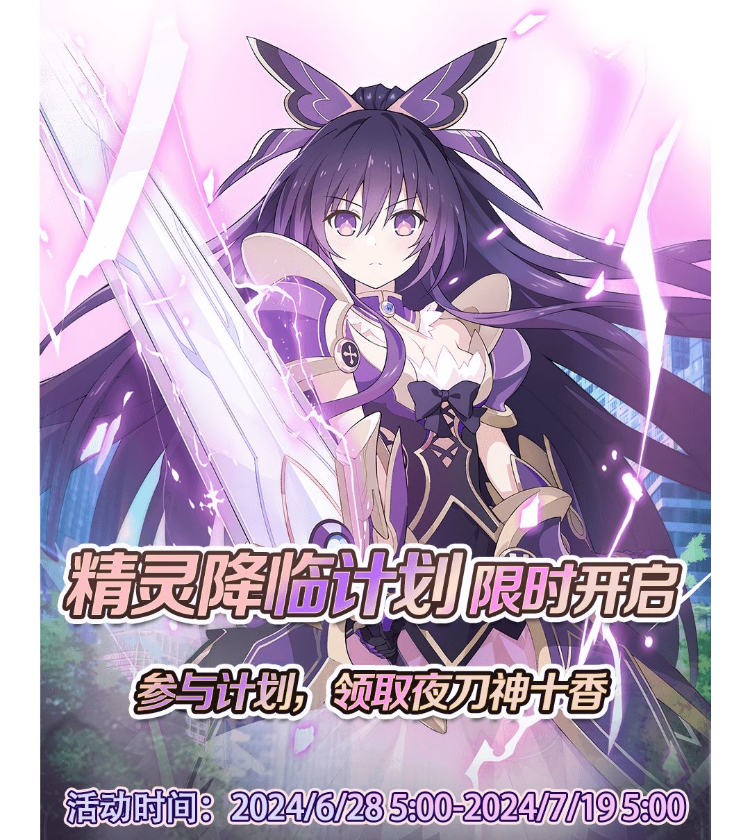 1、6月28日05:00:00~7月19日04:59:59,在精灵降临计划活动页面完成指定任务可领取夜刀神十香联动卡牌;