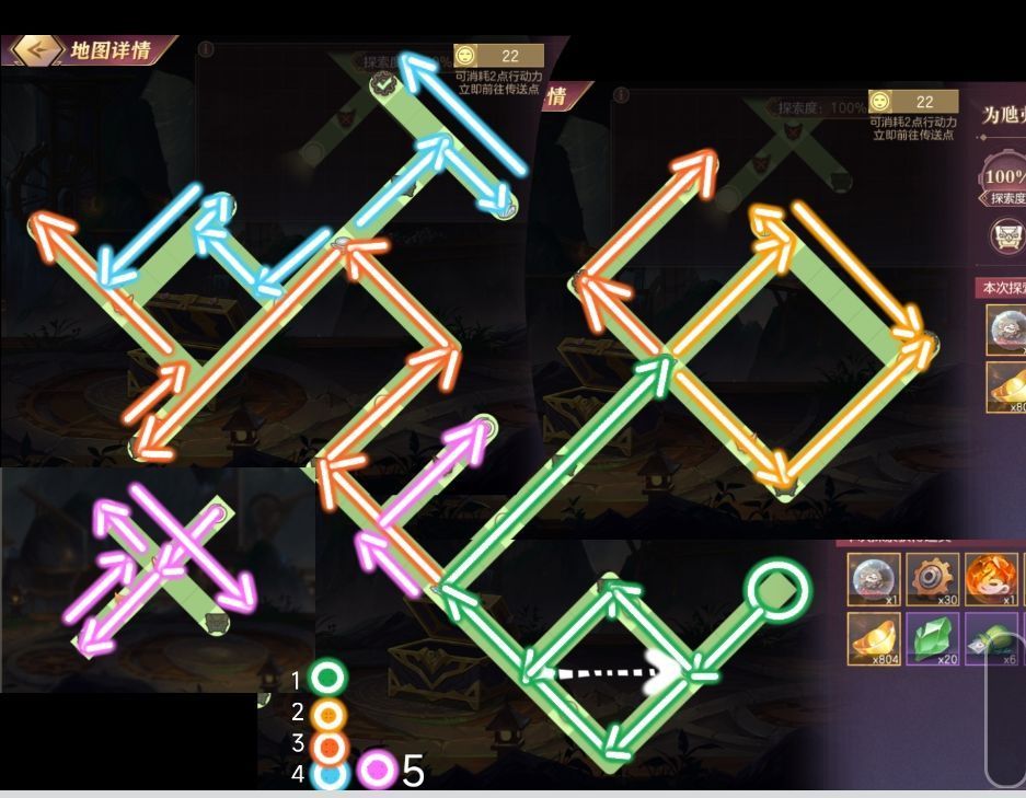 *跟着线路箭头前进,按照颜色顺序走完对应路径,相同的数字就是对应的传送位置哦~