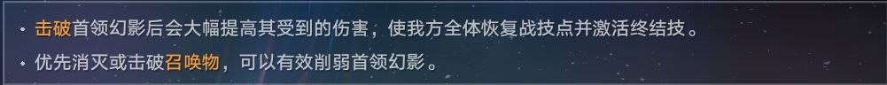 综上来看,本期末日幻影需要队伍中的角色能够迅速击败BOSS召唤物,从而将召唤物身上的属性弱点转移到BOSS身上,然后利用队伍中削韧高的角色将BOSS的属性弱点击破,之后就可以顺利完成挑战了。