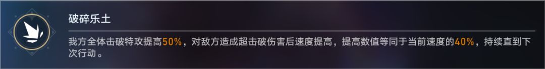 而在我方的增益方面则是有三个终焉公理可供选择:破碎乐土注重角色的击破特效,在击破弱点的同时还能为我方增幅速度,适合依靠弱点击破战斗的角色和与BOSS弱点相同属性的角色。