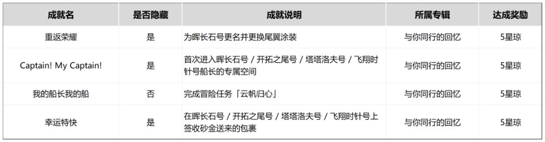 本期给大家带来的是星铁2.3版本新增内容——冒险任务「云帆归心」的全流程攻略,完成任务后可获得漫游指南*3、星琼*30、信用点*31000、金表钞*360以及4个成就(「重返荣耀」「Captain!My Captain!」「我的船长我的船」「幸运特快」)成就相关信息如下所示。