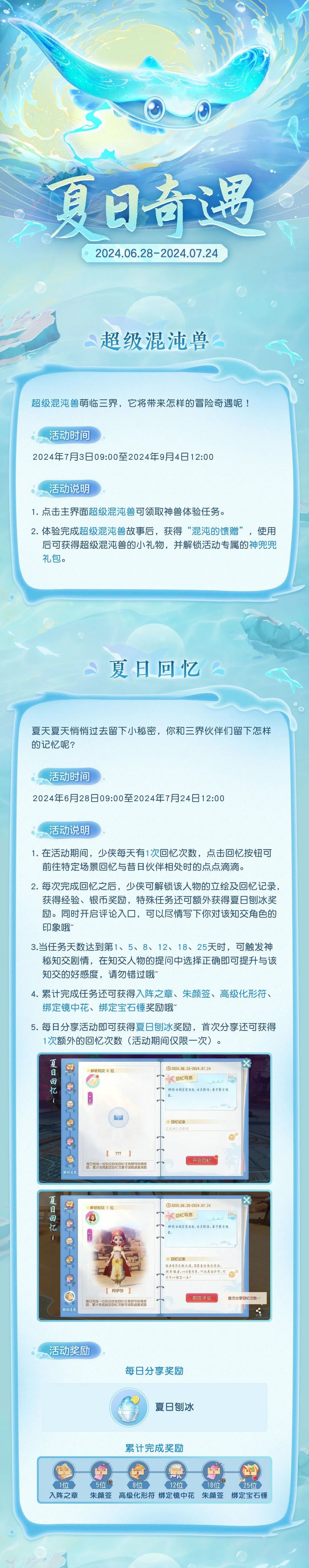 扫清酷暑,清凉一夏!2024暑期活动·夏日奇遇已拉开夏日序幕,快邀上你的小伙伴,一起前往三界体验,领取【朱颜签】、【绑定镜中花】、【绑定宝石锤】、【还灵丹】、【霓石图谱】等超值奖励,更有诸多返场外观、全新坐骑等你来拿!