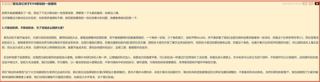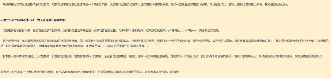 接着上图为这个人发的第二段内容,大概意思就是,游戏公测后不久开的联动作品投票中,玩家投出来的第一名是高达,第二名才是EVA,且差距非常之大,但高达受限于竞品因素、还有开放联动的审核时间等原因暂时还在沟通之中,所以官方只能选择EVA来作为游戏的第一个联动作品了,且EVA的联动费用在机甲类IP中不算便宜。那除此之外的其余作品也是因为不同的原因,目前只能慢慢推进了,例如鲁鲁修是被封杀过的......其中暗含的政治隐喻便是核心原因等等,这些作品估计也只能想想了,而官方后续也会慢慢推进其它的一些联动可能性。(另外这个人也明确说了,他的职位并非是社区经理的身份,所以聊这些东西也只是临时的,不过敢冒头说这些东西,负得起这个责任的,估计他在官方内部的职位不低,这点大家懂的都懂,维一也不便说太多了)所以在看了这些内容之后,维一其实个人是表示那就这样吧,毕竟和日本版权方合作其实是一个有些麻烦的事情,很多东西不是你想做就能做,毕竟版权在人家那,而且也不是他们求着我们来联动的,所以例如其中的沟通主动性,官方估计也有点冒火吧......但也莫法,维一还是那句话,欲戴王冠便需承其重,你做出了选择就必须为之付出选择的代价,目前玩家们的主流反馈和声音便是如此,但好歹官方还是出面解释了一番,这也能让更多朋友看到其中的一些不易吧,总之日后还是需要以此为戒的,有些事情或许不那么好解决,但终究是有备无患!今天的攻略文章就到这里,如果大家还有任何问题的话都可以添加维一的私人微信heerweiyi1015进行问询,感谢大家的支持!