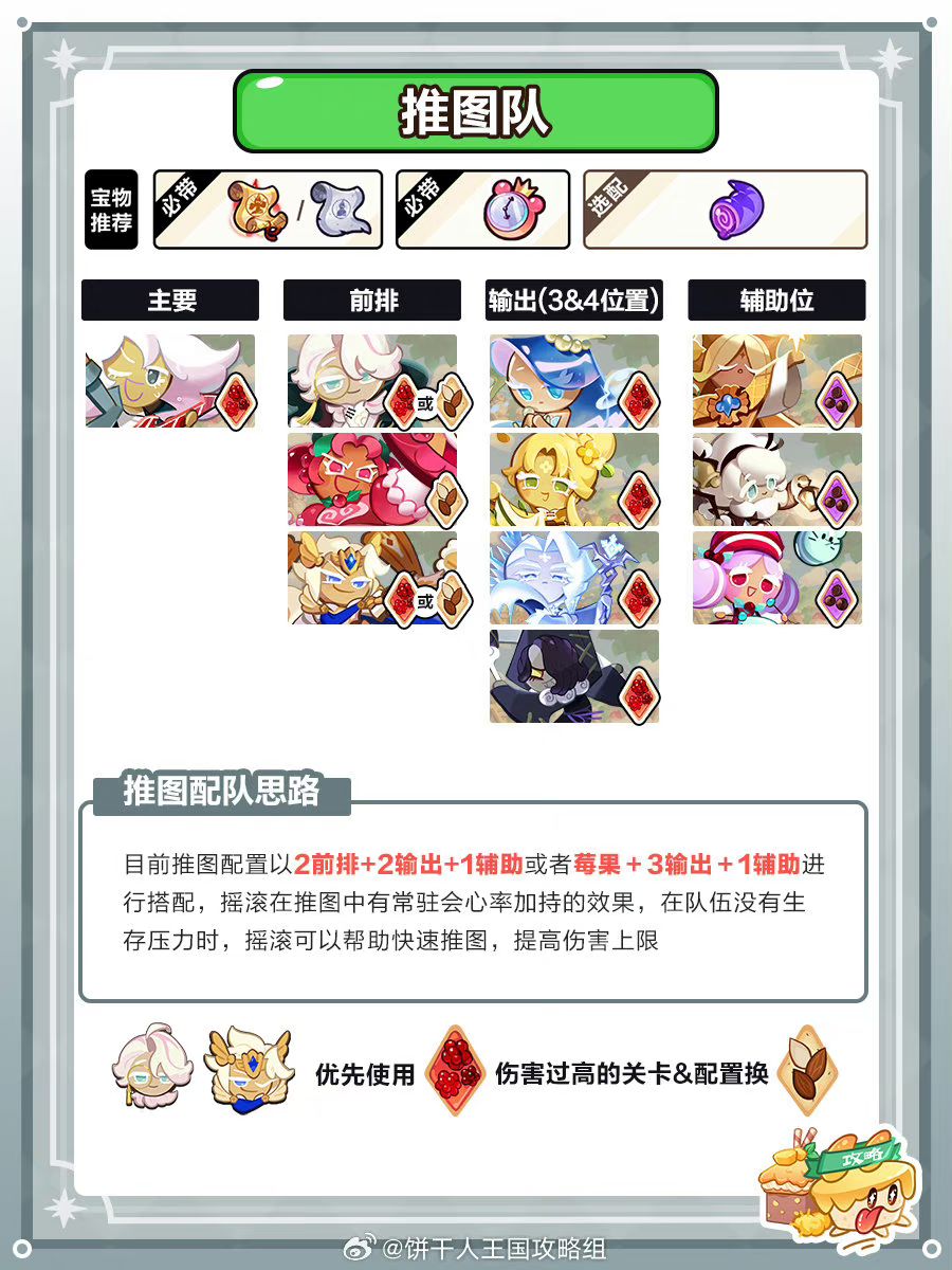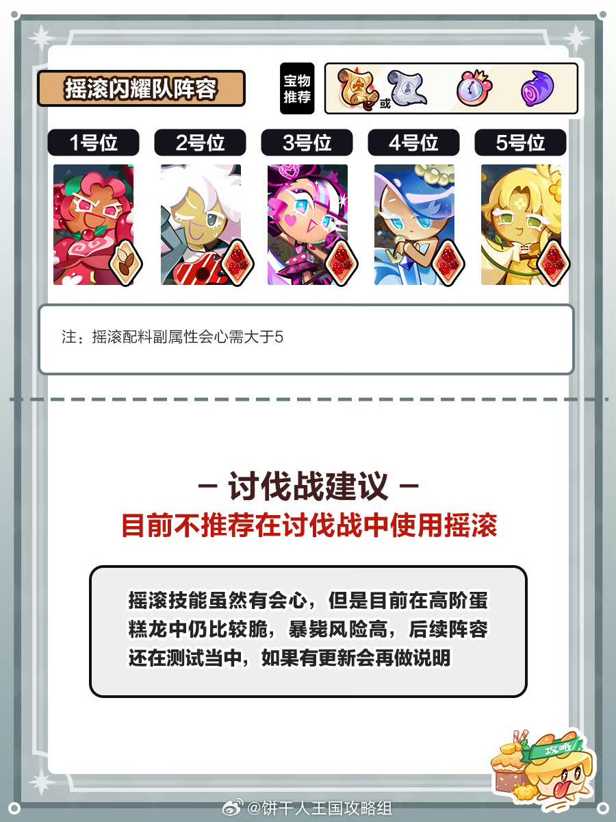 关于配料部分说明下,摇滚饼干只要自己的副属性会心达到5%,那么全队就能享受35%会心加成,在这个基础上,全攻击配料的奶量大于会心,全冷却的循环又高于会心,所以这里配料推荐为攻击or冷却[送花花]