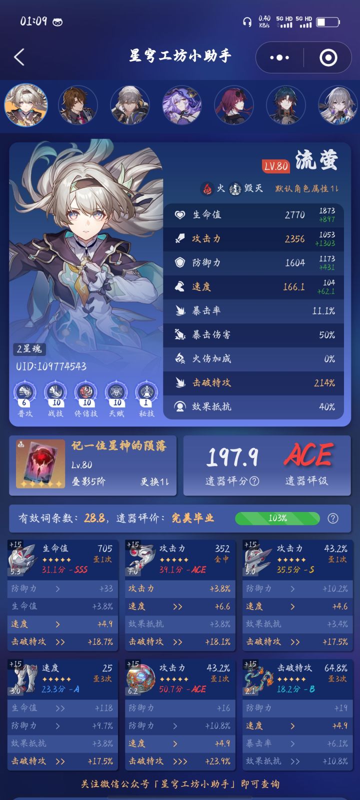 如果你的阮梅只玩击破队,则不需要刻意堆击破特攻,流萤吃不到增伤。光锥同理,有专武或精5记忆最好,没有则选择精5轮契。在只有0魂流萤且没阮梅专武的时候可考虑鸭专。