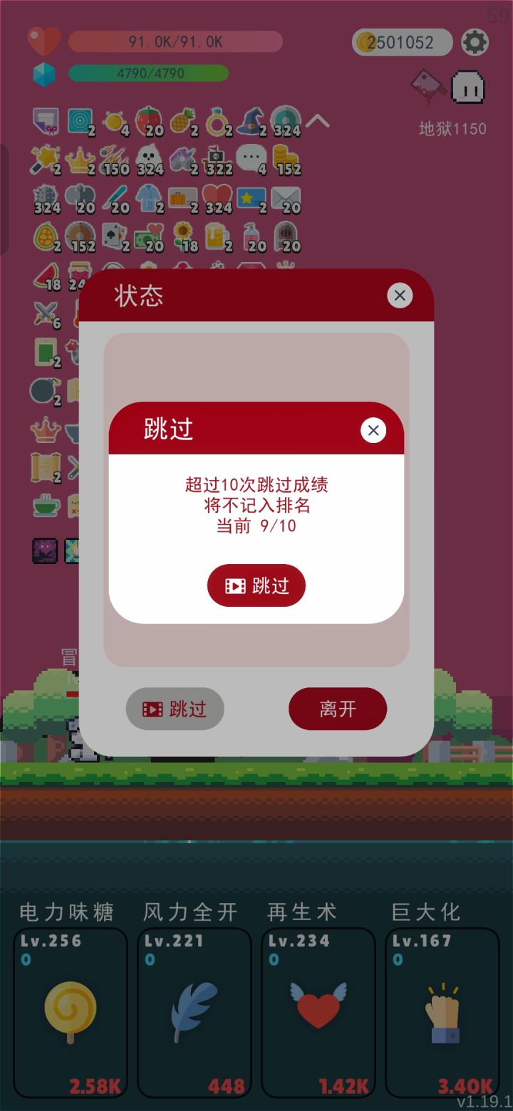 道具黄金皇冠,胜利奖金。技能巨大,电糖,再生。风力只为了跑的快。已经没有刷下去的必要和意义了。所有诅咒都上过一遍以后,以后每50关都是那个只能在篝火回血的同一个诅咒了。所以只能刷到1200关。那个排名是哪里看啊?他说跳过超10次,就不会上排名。