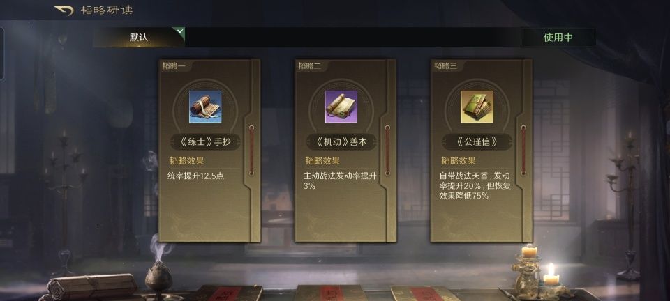 小乔的变化倒是没有那么大,天香把人搞虚的同时还能恢复兵力,确实也比较适合跟甄洛一起堵在前排。第二和第三技能,分别被搭配了料事如神和屈人之兵,缴械和技穷都给对招呼上。韬略自带小黄本,就是中规中矩的削弱和治疗。