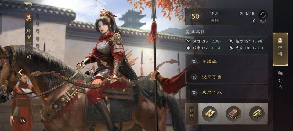 大部分的亮点,都在孙尚香的身上。专属战法弓腰姬的效果,在三国谋定天下这款手游里绝对称得上第一斩男神技,因为对于男性角色还有叠加增伤,要是队伍里全是男人,那可真是酸爽得叫天天不应啊!接下来的两个战法槽,郁皓君还十分贴心的放入了锐不可当和趁虚而入。除了大幅提升孙尚香自身的破甲伤害,还能跟小乔联动玩起虚弱组合拳。三本韬略依次是借势善本、原官善本和武女传,破甲倒戈加连击,对面就算奶妈是刘备都有点无力回天了吧!