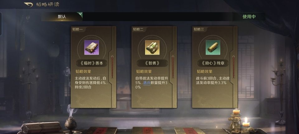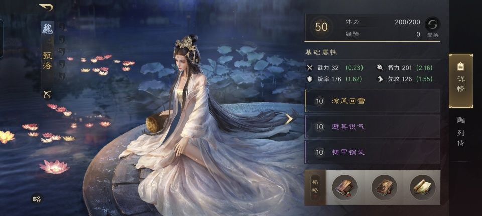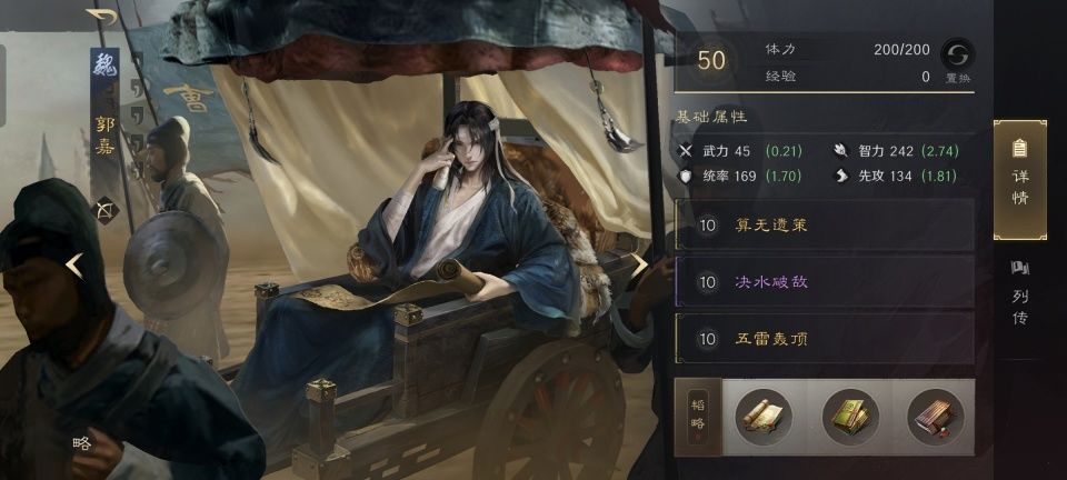 秉持着女士优先的绅士风度和抛砖引玉的写作思路,让甄洛率先出来亮相。流风回雪无论随机到郭嘉还是程昱,都能让他们其中一人获得洛神Buff,从而触发奇谋攻击。之后似乎没什么心机,叠加的两个紫色战法分别是避其锐气和铸甲销戈,就是要强化防御。然而值得注意的是,韬略之中的洛神赋下卷,明显是把施展奇谋的机会优先分配给程昱,毕竟勇冠贲育的程昱,在武艺方面确实要比郭嘉高出不少。