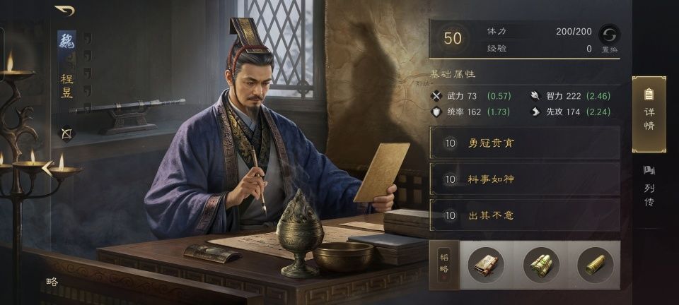 相比之下,真正的重头戏还是在程昱的身上。通过洛神带来的奇谋和郭嘉算无遗策的6%,程昱默认战法勇冠贲育的发动率将高达66%,无论是直接造成的伤害还是继而引发的逃兵,都会更加水涨船高。第二战法和第三战法依次是料事如神和出其不意,力争把打击范围覆盖到对面三人,还要牢牢套上技穷。最后凭借智勇韬略把勇冠贲育的发动率加到了71%,逃兵数量还提升了30%。