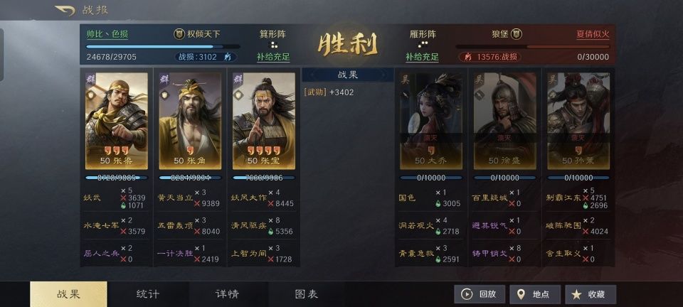张角是橙将,他的两个弟弟张宝和张梁也被三谋的游戏策划设计成了橙将,真是一家人实现了整整齐齐。本期的主角,一个游戏ID名为帅比色损的哥们,就用他的黄巾三宝队完成了十连斩。咱也不妨细致观摩一番,到底是怎么做到的。
