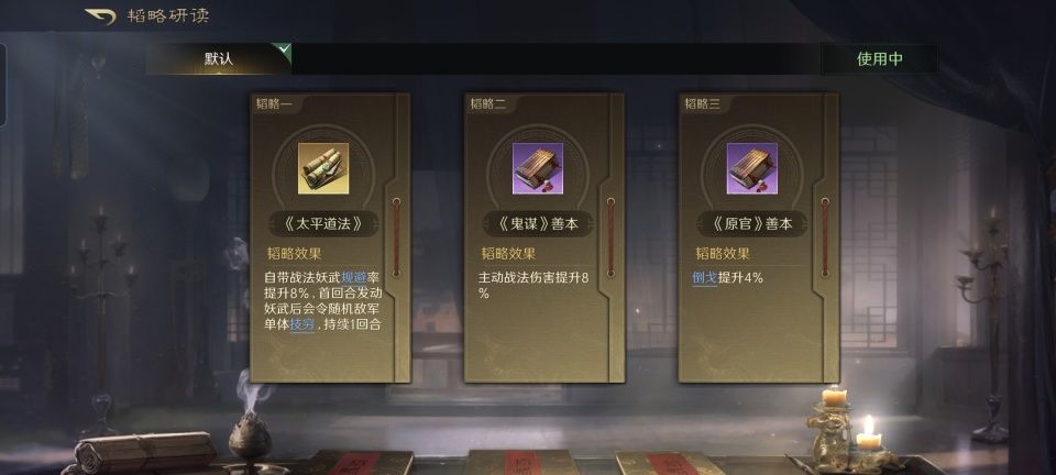 二弟张宝,世人称之为“地公将军”,在三谋游戏里获得了狂风大作的默认战法,也是很多顶级谋士非常喜欢装备的技能之一。在此基础上,额外给他安排了治疗系的清风驱疾和谋略攻击系的上智为间,在妖术、狂风这两个负面状态之后还可以给对手施加混乱。三本韬略书依次是机动善本、鬼谋善本和太平道法,既进一步提升自己的主动战法伤害,又压制了对手的会心和奇谋概率。