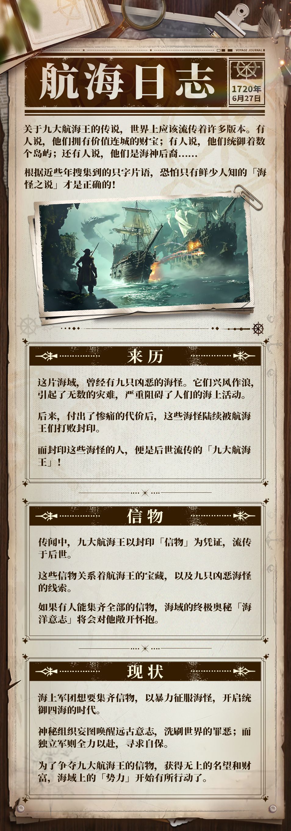 Tap朋友们上午好,股哥这次为大家带来了我们的背景故事:传说中的九大航海王,他们以「信物」流传后世。是追求无尽的财富,还是利用「信物」维持海洋正义?一切的一切都交由海域上的你们来决定!更多爆料内容请关注股哥!