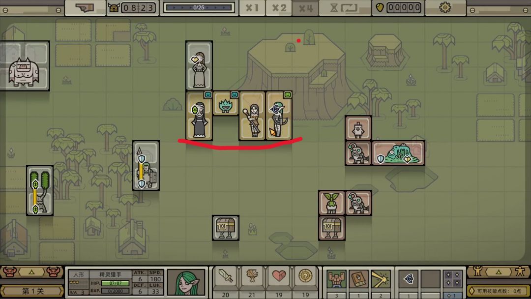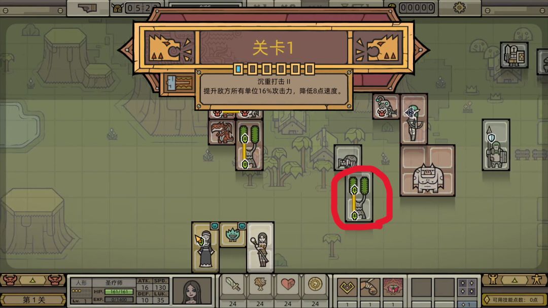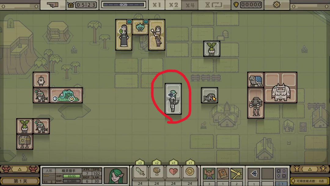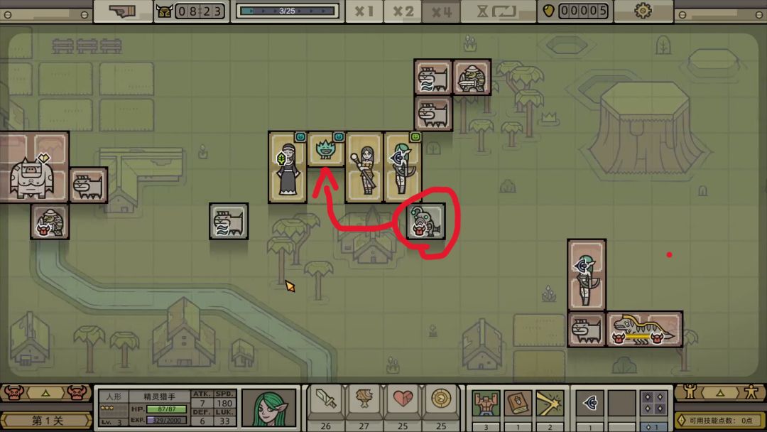 3.开局的任务是组建军团雏形,主要任务为寻找带远程符文的输出、带愈疗符文的后排、带攻击符文的工具人。精灵射手是比较不错的输出单位(图4),将她招募到前面入队。看到一个带攻击符文的生物,正好可以补上毒液怪那里的空缺(图7),正好可以把攻击符文扩散开来。二叉树是不错的带愈疗的单位(图8),一般最好下面是空的符文,方便扩散攻击符文,招募的时候可以清除符文,让修女扩散一个愈疗符文给它。