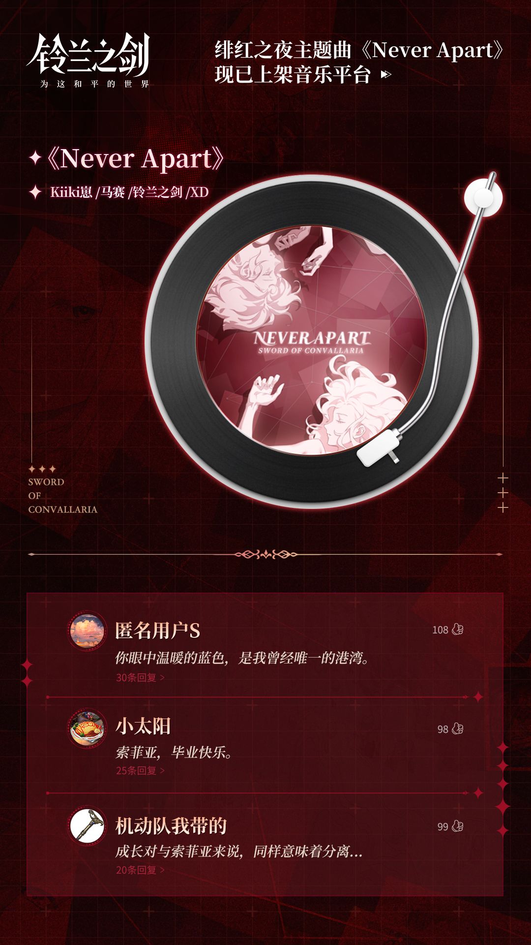 欢迎团长在音乐平台分享对「绯红之夜」主题曲《Never Apart》的乐评,截图发布至评论区,小场记会抽3位团长送出【铃兰之剑限定披风】~
