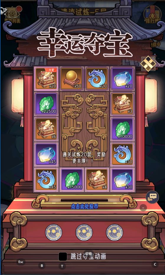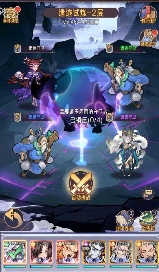 遗迹试炼仙友可以选择六个神将前往探索,在探索中每一次挑战只能一名神将前往,每层有四个小怪和一个boss,先要将小怪打完才能打boss,进入试炼时会有三个封印卷轴和三个金疮药,封印卷轴可以封印除boss以外的任意一个小怪,金疮药可以恢复选定的一名存活的神将一半的血量,每通关一层可以获得玄石和银两以及随机的奇遇;奇遇有砸金蛋,抽奖,商店等。