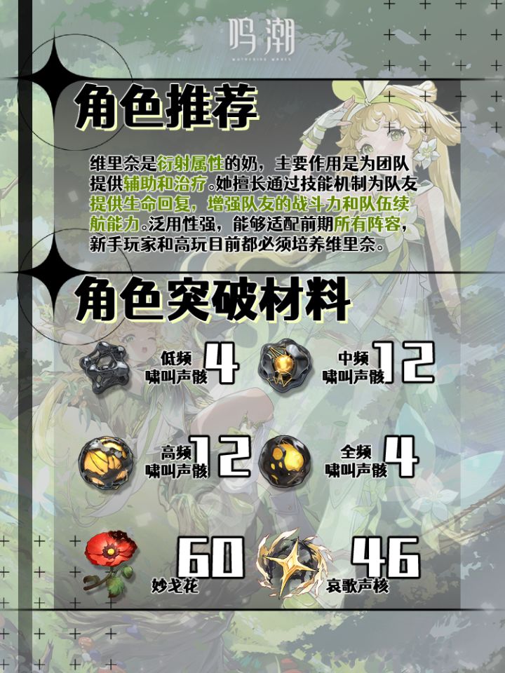 维里奈是衍射属性的奶,主要作用是为团队提供辅助和治疗。她擅长通过技能机制为队友提供生命回复,增强队友的战斗力和队伍续航能力。泛用性强,能够适配前期所有阵容,新手玩家和高玩目前都必须培养维里奈。