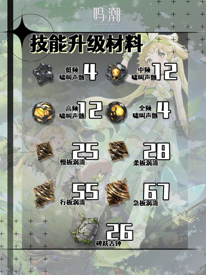低频啸叫声骸*4、中频啸叫声骸*12、高频啸叫声骸*12、全频啸叫声骸*4、妙戈花*60、哀歌声核*46