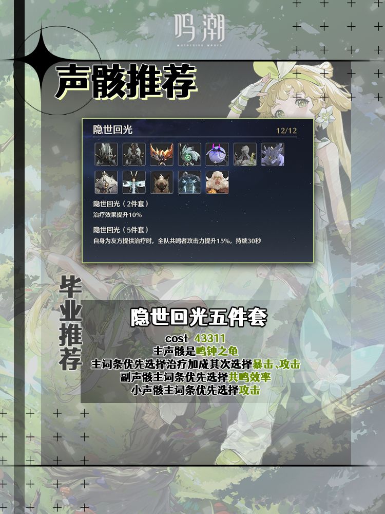 (毕业):隐世回光*5,cost43311,主声骸是鸣钟之龟,主词条优先选择治疗加成其次选择暴击、攻击,副声骸主词条优先选择共鸣效率,小声骸主词条优先选择攻击。副词条:共鸣效率>攻击力>百分比攻击>其他。(过渡):隐世回光*2+不绝余音*2,cost43111,词条与毕业套相同。