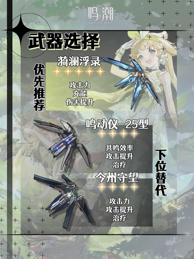 武器优先选择常驻池的五星武器漪澜浮录(攻击力、充能、伤害提升),下位替代为优选锻造武器鸣动仪-25型(共鸣效率、攻击提升、治疗)和常驻池的四星武器今州守望(攻击力、攻击提升、治疗)也可以选择大月卡武器清音(暴击率、攻击提升)。维里奈需要叠攻击力来提升治疗量,所以武器优先选择能够随便吃满攻击力加成的。