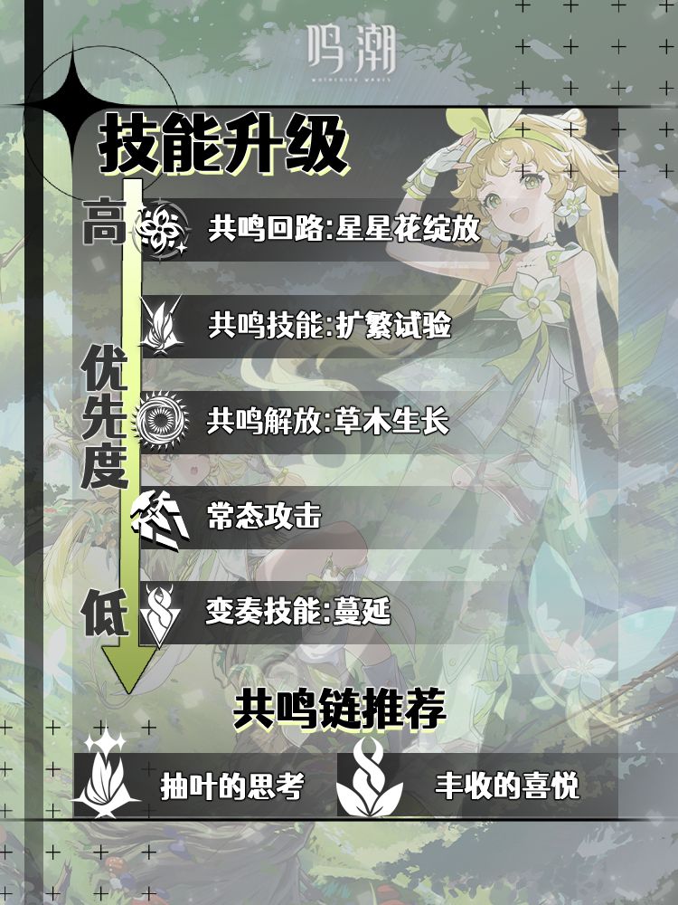 共鸣链推荐:2.抽叶的思考:施放共鸣技能时,额外获得1点【光合能量】和10点协奏能量。(加快协奏循环)6.丰收的喜悦:重击星星花绽放及空中攻击星星花绽放的伤害提升20%,命中目标时触发1次协同攻击,并为附近队伍中所有角色回复生命值,此次协同攻击伤害和回复生命值等同于共鸣解放光合标记。(协同攻击、伤害提升、全队回血)