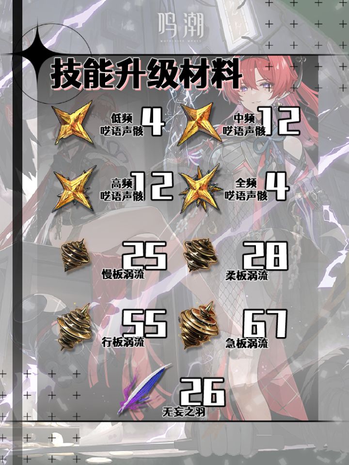 低频呓语声核*4、中频呓语声核*12、高频呓语声核*12、全频呓语声核*4、慢板涡流*25、柔板涡流*28、行板涡流*55、急板涡流*67、无妄之羽*26
