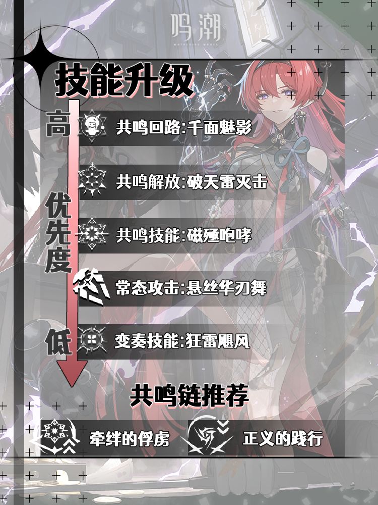 吟霖0命就是完全体,有钱可以补2.牵绊的俘虏:共鸣节能磁殛爆发命中时额外恢复5点【审判值】和5点共鸣能量。(加快技能循环和回能)6.正义的践行:施放共鸣解放破天雷灭击后的30秒内,吟霖的普攻命中目标时额外触发疾霆昭彰,造成吟霖攻击力419.59%的导电伤害,每段普攻可触发一次,最多触发四次,此次伤害为共鸣技能伤害。(高额增伤)