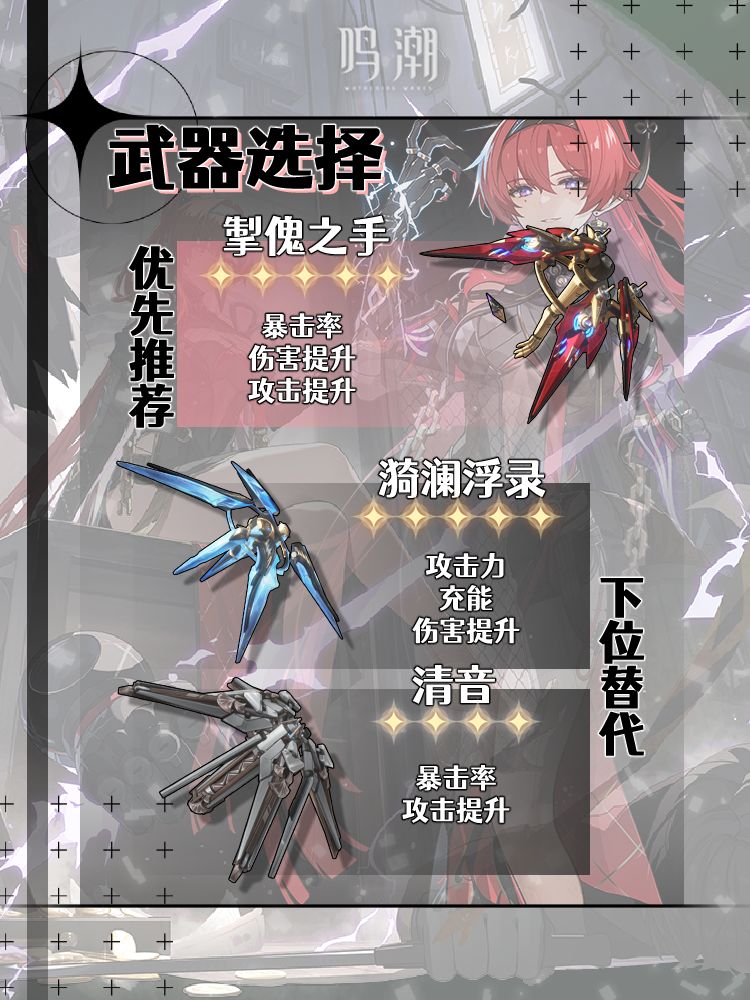 首选专武掣傀之手(暴击率、伤害提升、攻击提升),次选常驻池五星武器漪澜浮录(攻击力、充能、伤害提升),再次大月卡自选武器清音(暴击率、攻击提升),常驻池四星武器今州守望(攻击力、攻击提升、治疗)