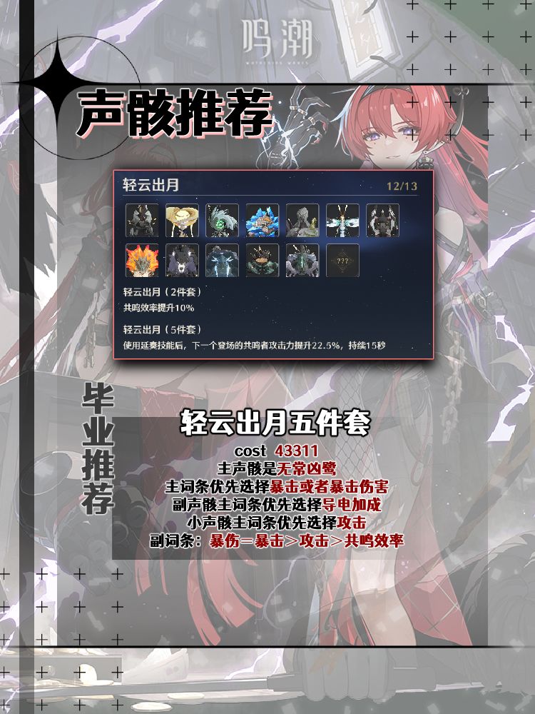 (毕业):轻云出月43311,主声骸选择无常凶鹭,主词条选择暴击或者暴击伤害,副声骸的主词条选择导电加成,小声骸主词条选择攻击,副词条:暴伤=暴击>攻击>共鸣效率。(过渡):轻云出月2件套+彻空冥雷2件套44111,主声骸:无常凶鹭、云闪之鳞、鸣钟之龟,词条与毕业相同