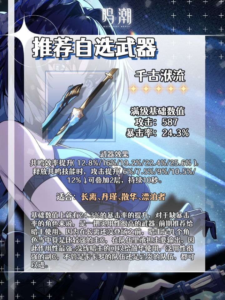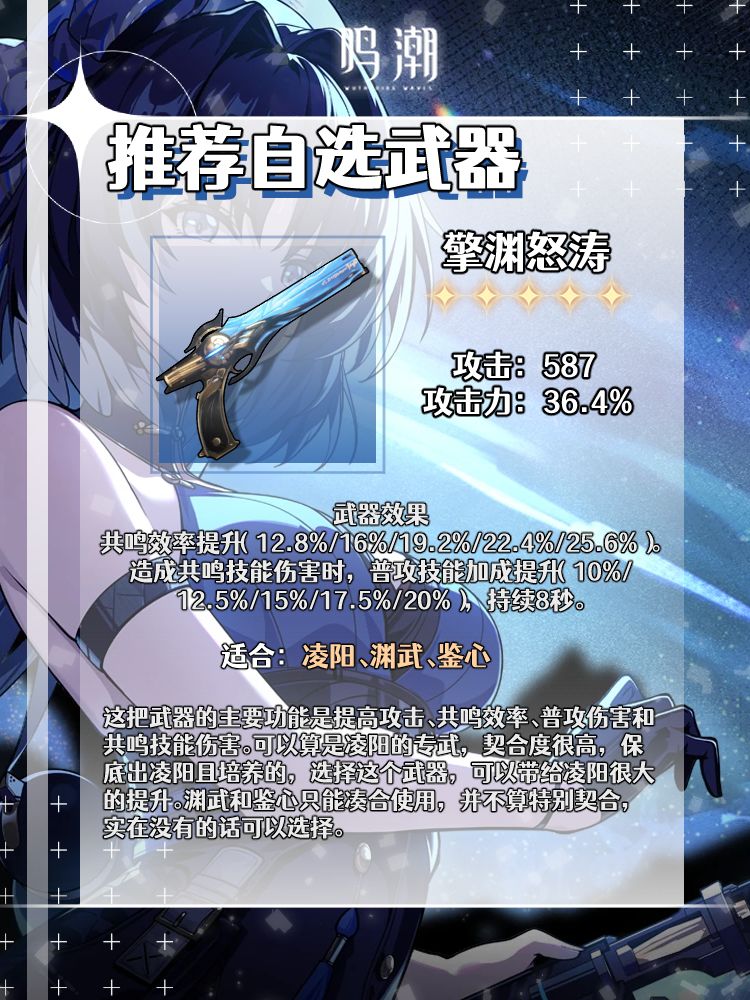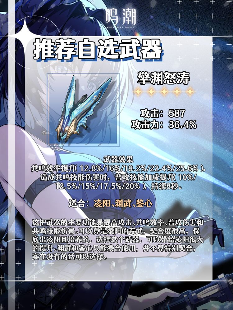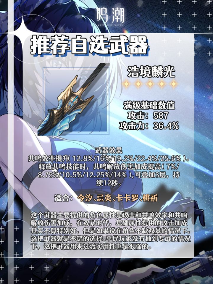 武器效果:共鸣效率提升(12.8%/16%/19.2%/22.4%/25.6%)。释放共鸣技能时,共鸣解放伤害加成提高(7%/8.75%/10.5%/12.25%/14%),可叠加3层,持续12秒。