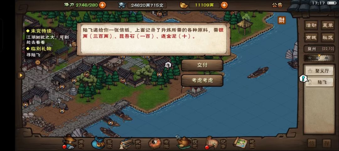 泉州海上飘来一块木板,上面有个半死不活的人,救下后得知是傅九三的故人。巨鲸帮海江河、陆飞处打听。得知傅九三隐居在泉州北面的小渔村。清源山北面(4,0)进入渔村。