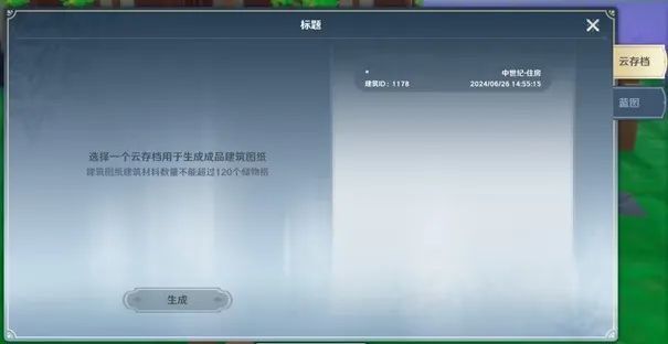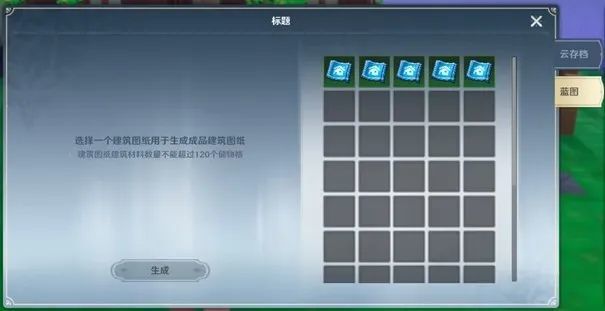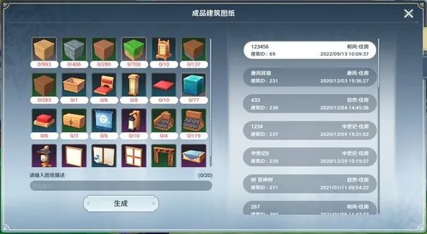 左侧为该建筑所需的建材在背包和储物箱准备好相关建材点击【生成】按钮,将自动扣除背包和储物箱内的相关建材,生成成品建筑图