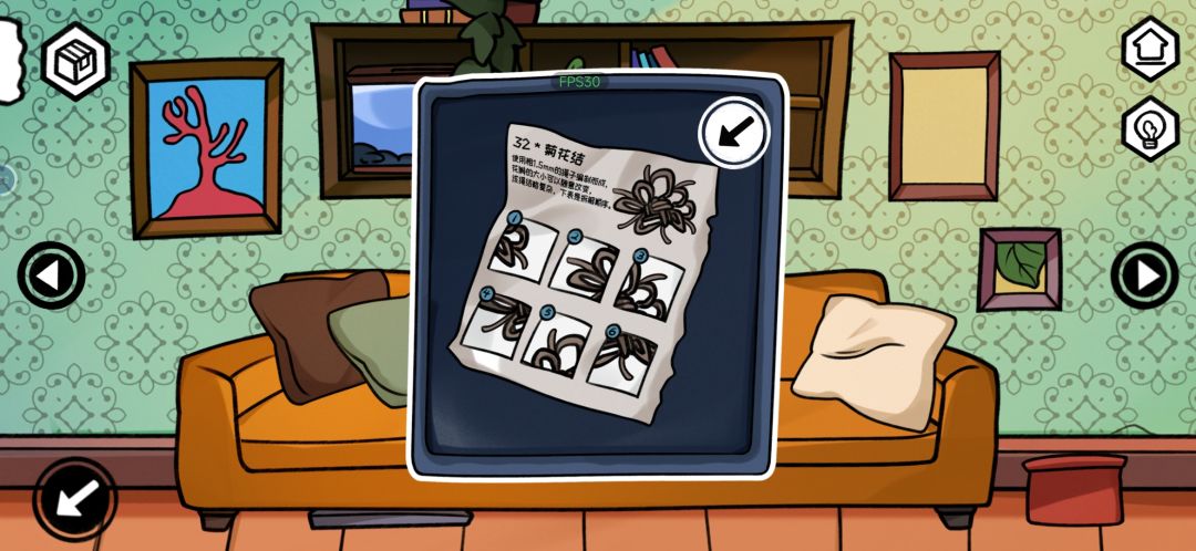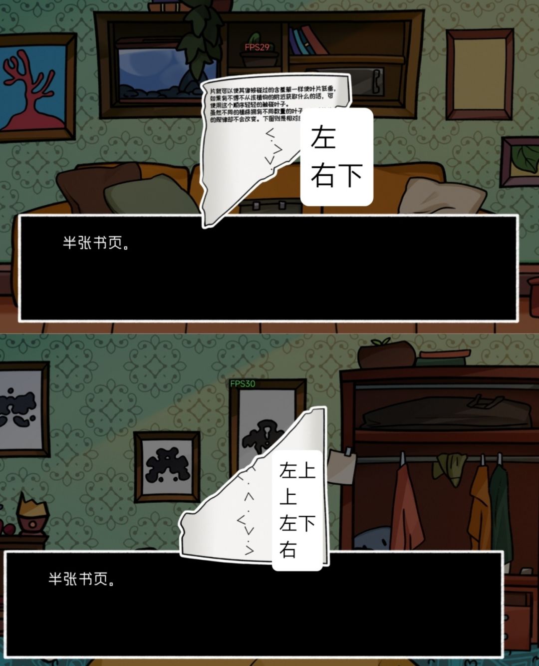 用复活钥匙打开书架下的柜子,叶子的点击顺序是卧室床边和沙发抱枕下的半张书页上的线索