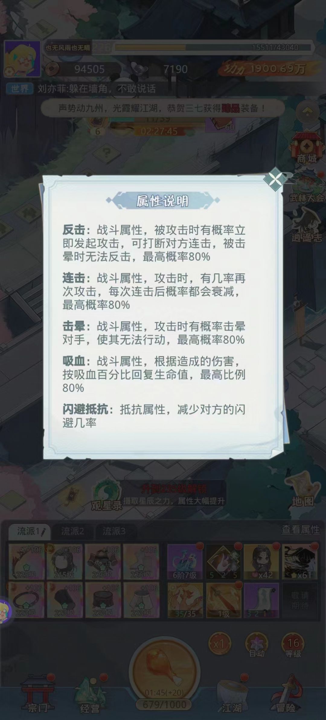 8件装备,建议全部选择击晕+抗闪避属性,击晕流比较害怕的就是闪避,出了闪避就代表无法控制。全部强化完,携带击晕宠物,击晕概率可达300左右,抗闪避可达250左右,配合功法基本可以实现同阶段无限控制,如果想玩PVP的玩家,也要注意提高身法,优先出手。