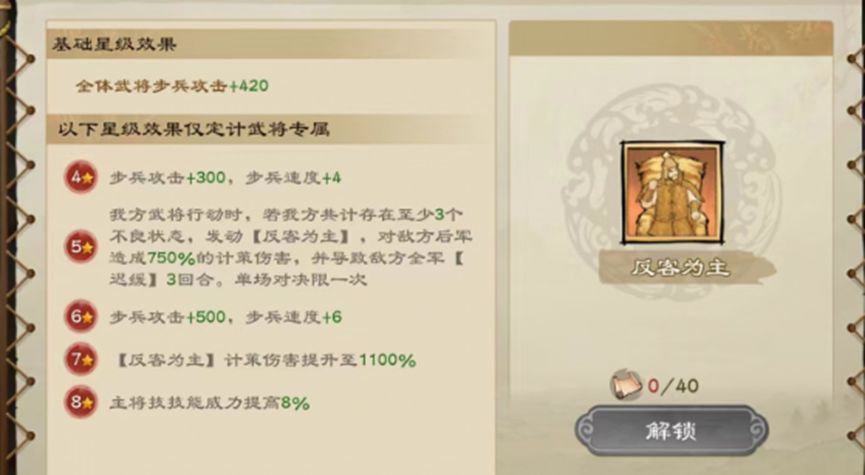 反客为主:当我方存在3个不良状态,就会造成750%倍率的伤害,并吃迟缓1回合,7星金斗不作考虑,只评估这个机制,很大的问题就是在于,750%的倍率很高,但是需要有3个不良状态,大部分的武将,其并没有那么多的不良状态,而是三种是不重叠的,例如火灾+殇曲+倾国虚弱,但是要保证这些技能全部释放不被识破,且还是都带的情况泛用性不太够,而且750%的倍率很高,但参考称火打劫的伤害,一发称火打劫240%的倍率,打1000多居多,那么类比750%的倍率就是差不多5000伤害,伤害是很高,但是不够影响战局,而且还是后军输出,大部分当前的核心角色, 基本都是依赖前军为主,所以只能给到T2
