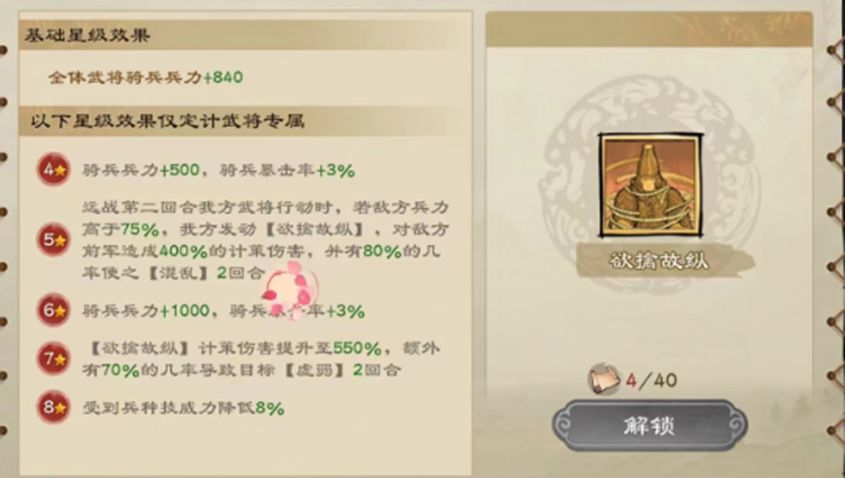 单次承伤超过10%最大兵力的时候,对后军造成300%倍率伤害,并且50%的概率内讧,在游戏中,所有概率,不搭配狐狸兵符,都是扯淡,而且300%倍率也不高,还是后军,控制还不稳定,7星的斩将,我看不见