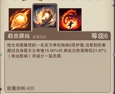 2技能消耗能量420,给生命值最低的一名友方单位施加2层护盾,当受到伤害超过自身最大生命值15%.00%时,使此次伤害降低21.87%(幸运影响)并减少一层护盾。