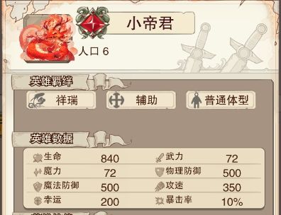 首先了解一下小帝君的基本属性。普通体型,6人口,祥瑞1,辅助1,帝君可以说是所有小体型队伍人手必备的角色,