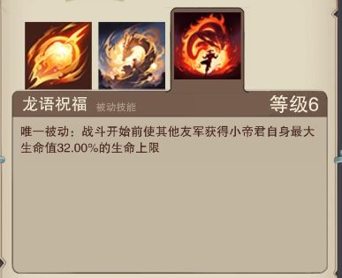 唯一被动:战斗开始前使其他友军获得小帝君自身最大生命值32%的生命上限。