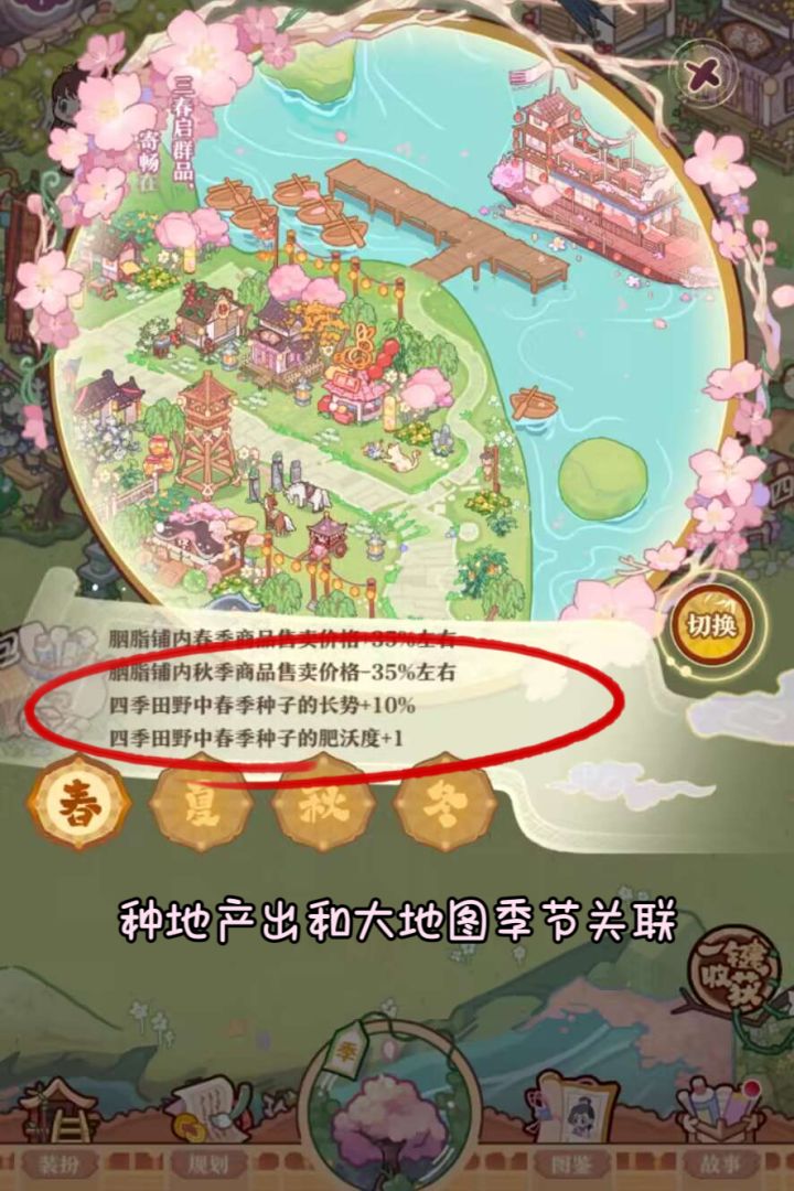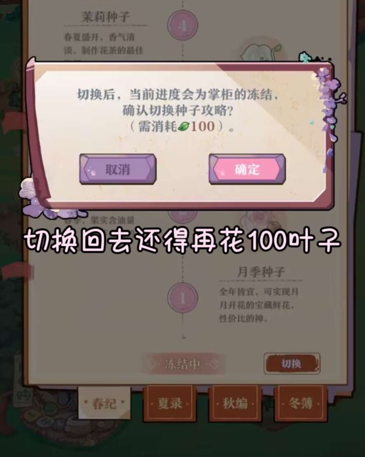 2.季节切换:在选择季节之后,随着种子解锁会有经验加成和种子折扣,切换了之后已经解锁的种子恢复原价且还能购买,所以不用担心切换影响配方解锁;