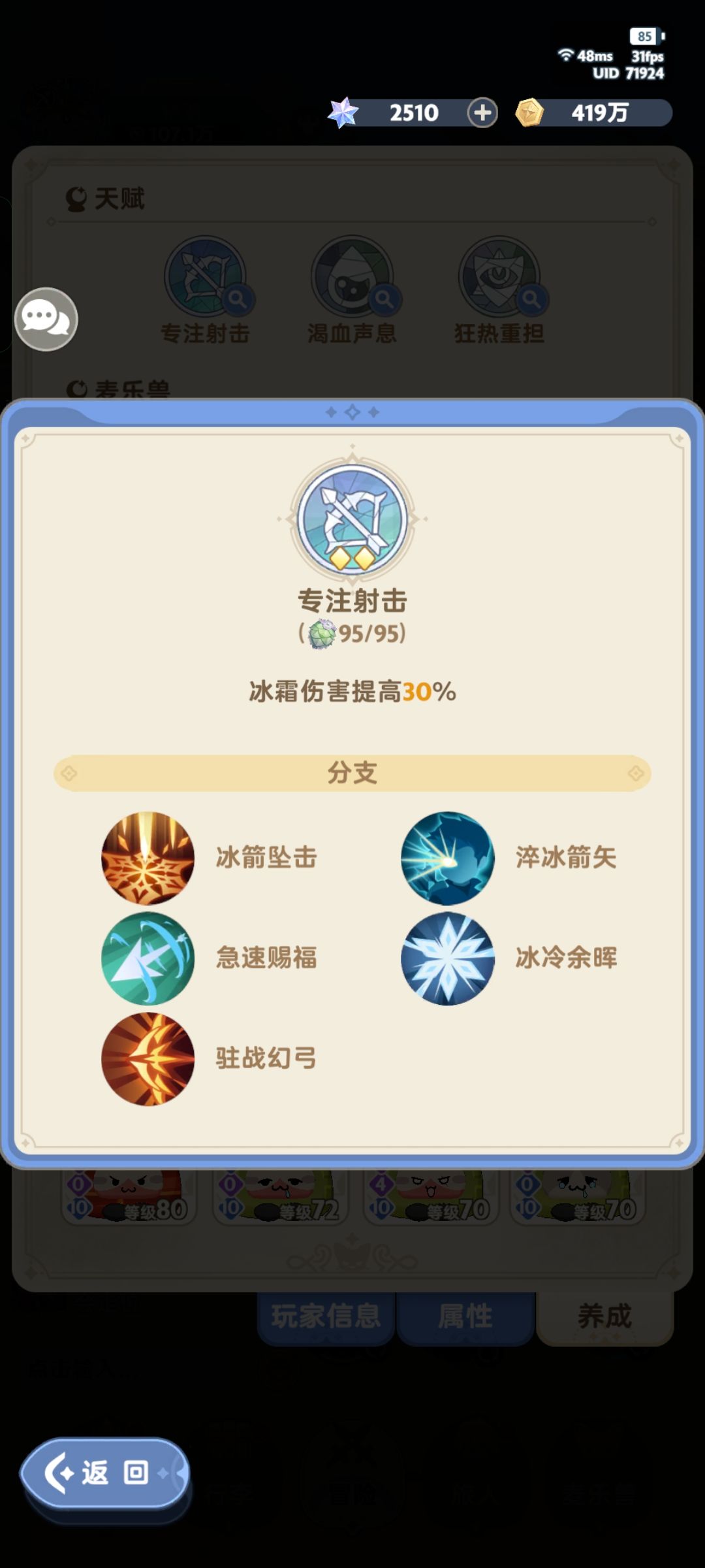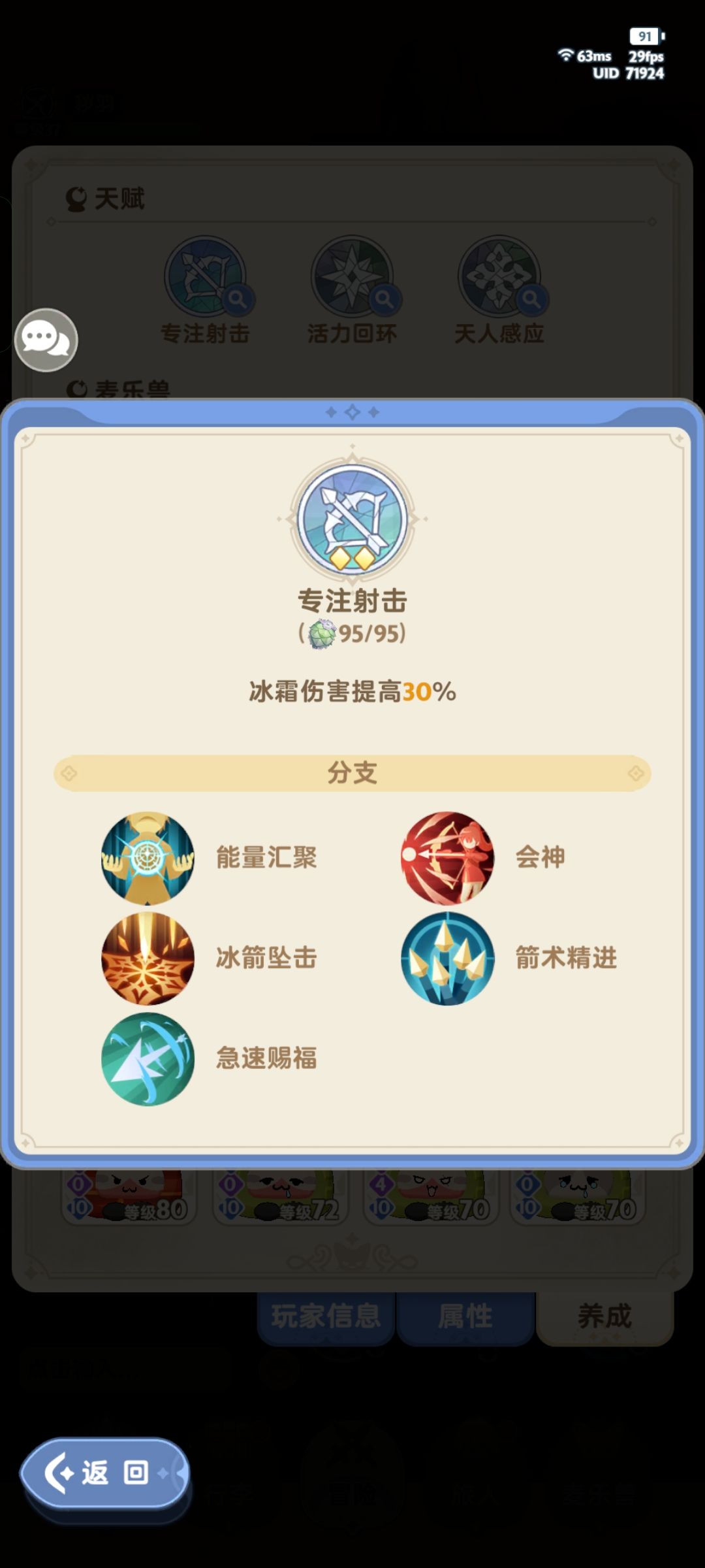 其他本建议全用长线这套,每个人面板不通可能适用的天赋不一样,只能说给个参考还得自己试试。属性优先满命中然后50+暴击40+技巧,再往上优先提暴击,二三天赋看情况补面板,在一分五十秒左右可以达到能量不断档,长线伤害高的核心就是叠满箭术精通之后能量不断。