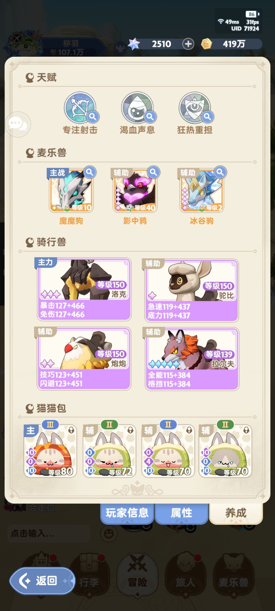 再补充一下猫猫包的配置,个人觉得不是氪佬的话选择太少了,直接放弃词条去堆面板吧,谁战力高用谁。1号位有华夫就用华夫,就是那个直接加15攻击60秒之后会叠加的猫。其他的看着用,感觉除了那个杀怪叠攻击的都差不多。。加命中和伤害的没抽到不做评价。