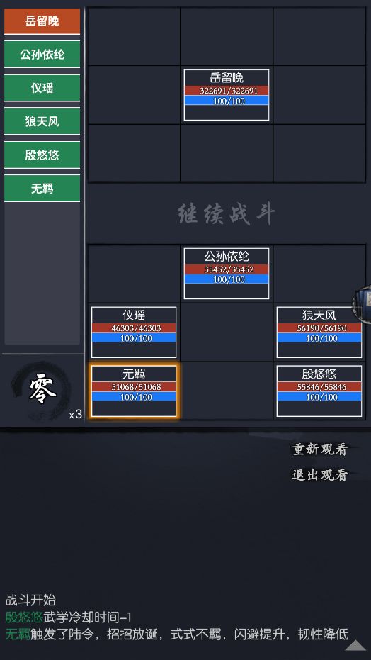 由于瞪目的存在,我们这关不需要输出侠客上场,并且三气一剑会提供大量的防御,